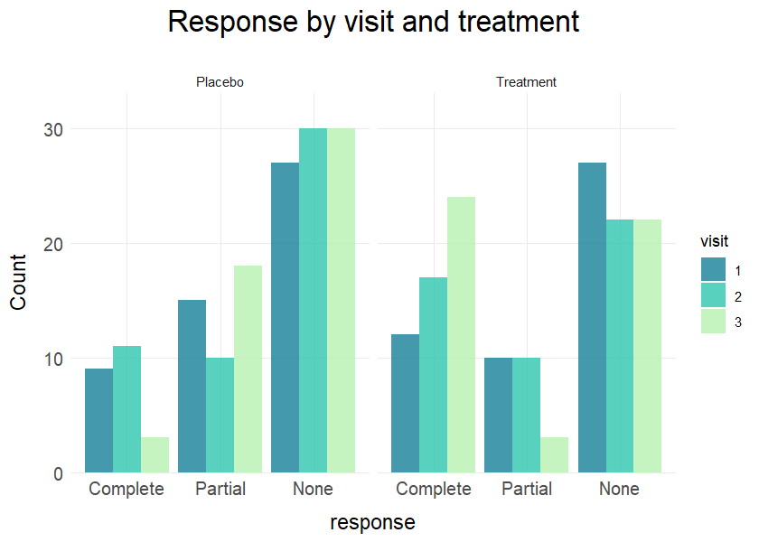 title = "Response by visit and treatment",values = TRUE)